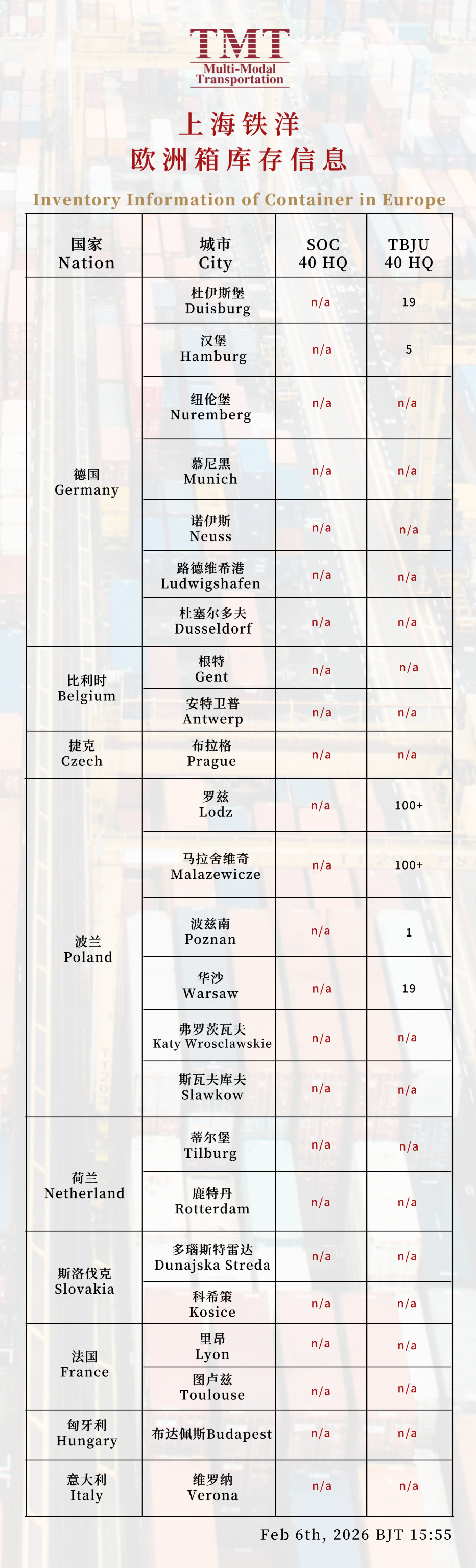 上海铁洋-欧洲箱库存信息(每日更新)